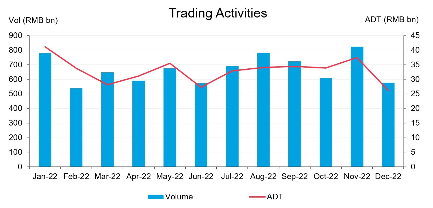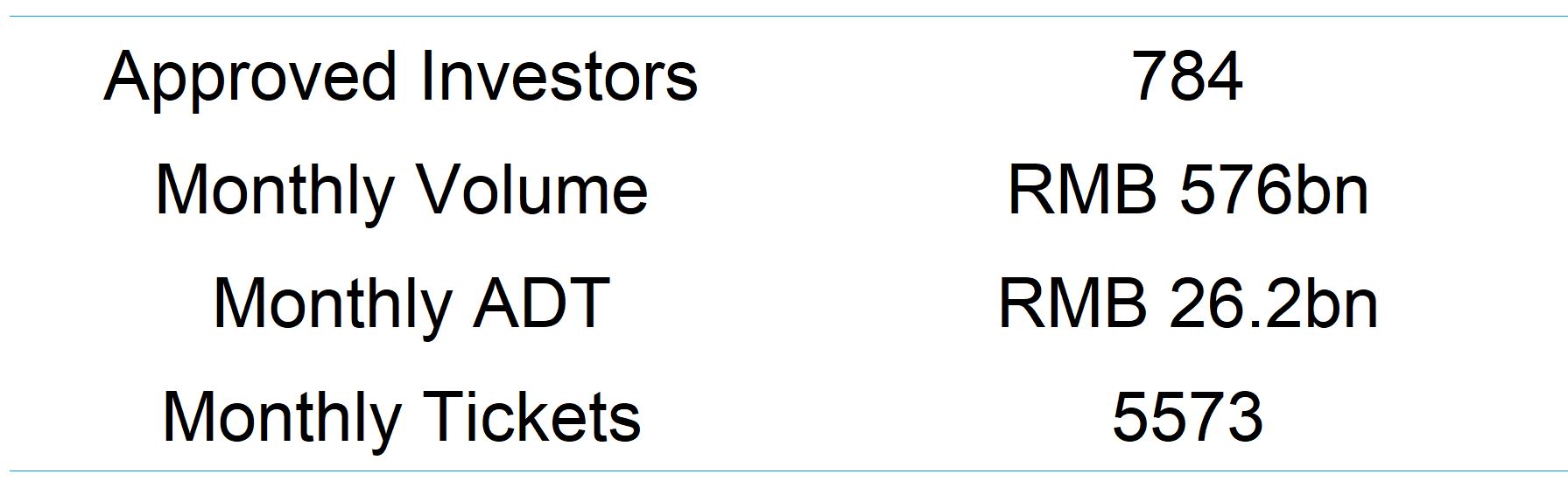 - In 2022, Northbound Bond Connect yearly trading volume hit RMB 8 trillion totaling 82,981 tickets. Average daily turnover throughout the year rose to RMB 32.2 billion. All the three indicators have reached new highs.