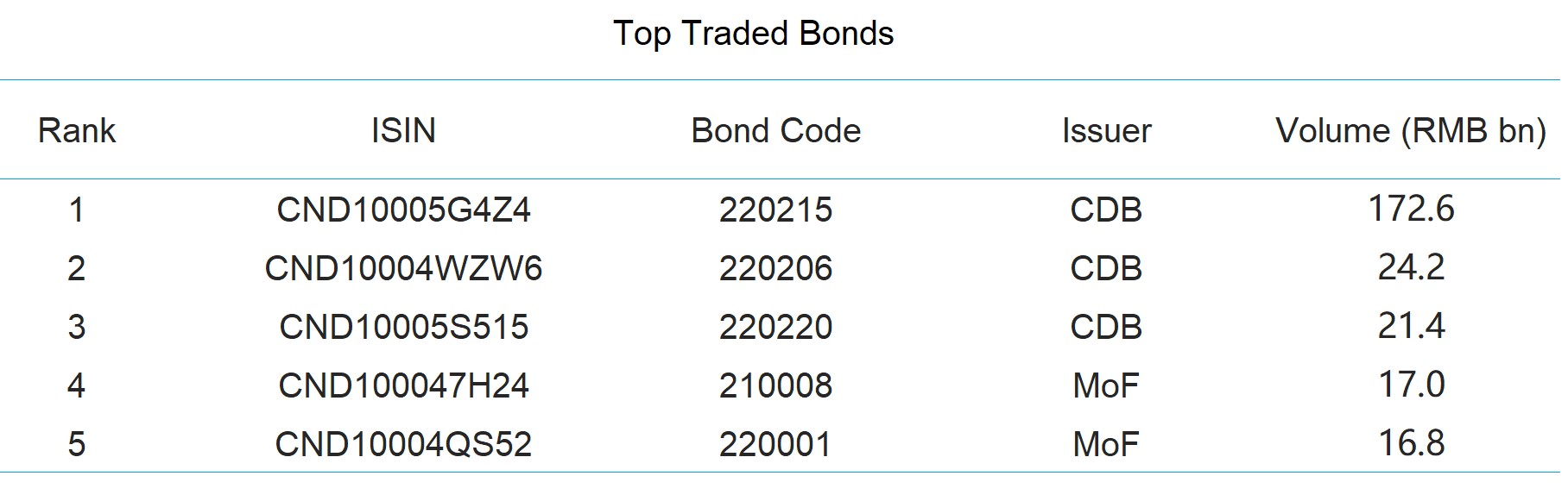 - Monthly trading volume of December was RMB 576 billion, with monthly average daily turnover standing at RMB 26.2 billion. Most trading activities centered around Chinese government bonds (42%) and policy financial bonds (48%).
