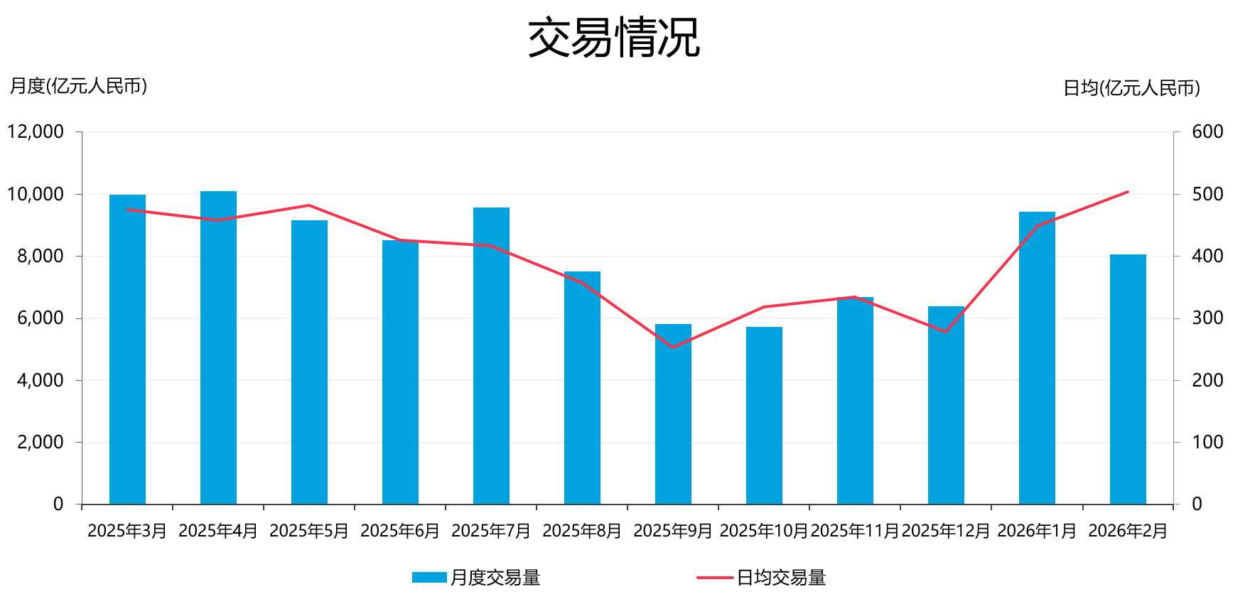 - 债券通北向通:2026年2月成交8055亿元人民币,月度日均成交503亿元人民币。政策性金融债和国债交易最为活跃,分别占月度交易量的52%和30%。