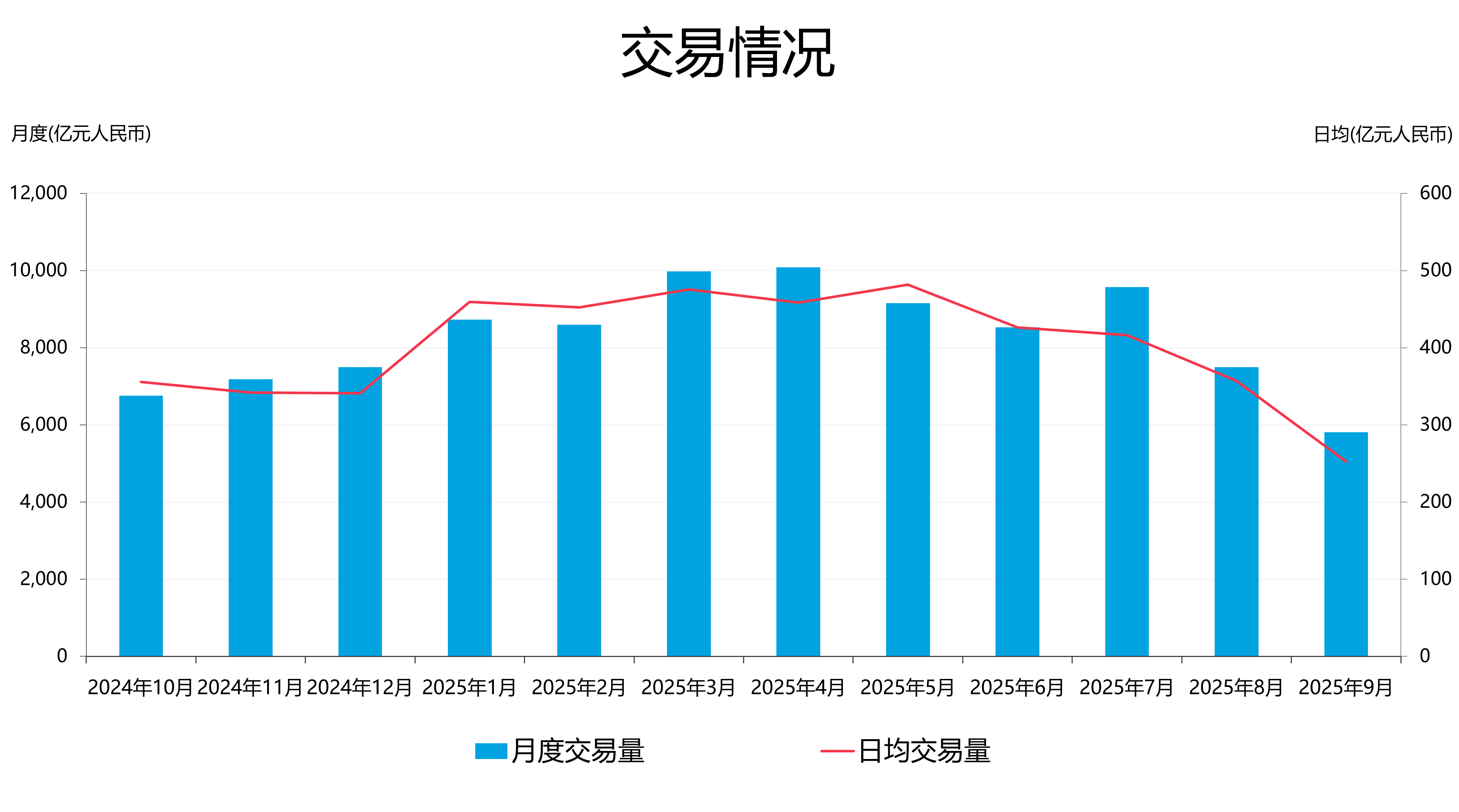 - 债券通北向通:9月成交5810亿元人民币,月度日均成交253亿元人民币。国债和政策性金融债交易最为活跃,分别占月度交易量的49%和33%。